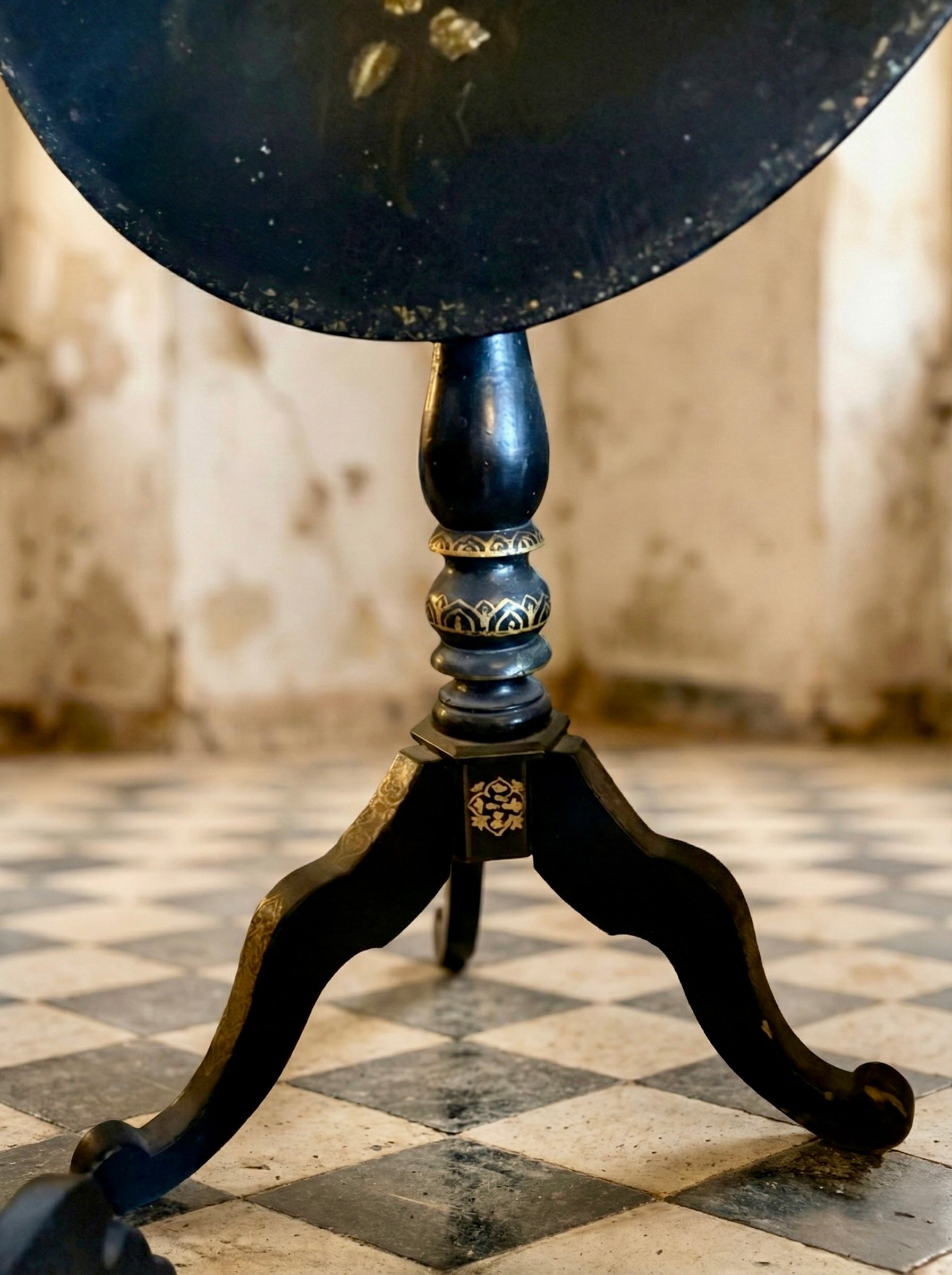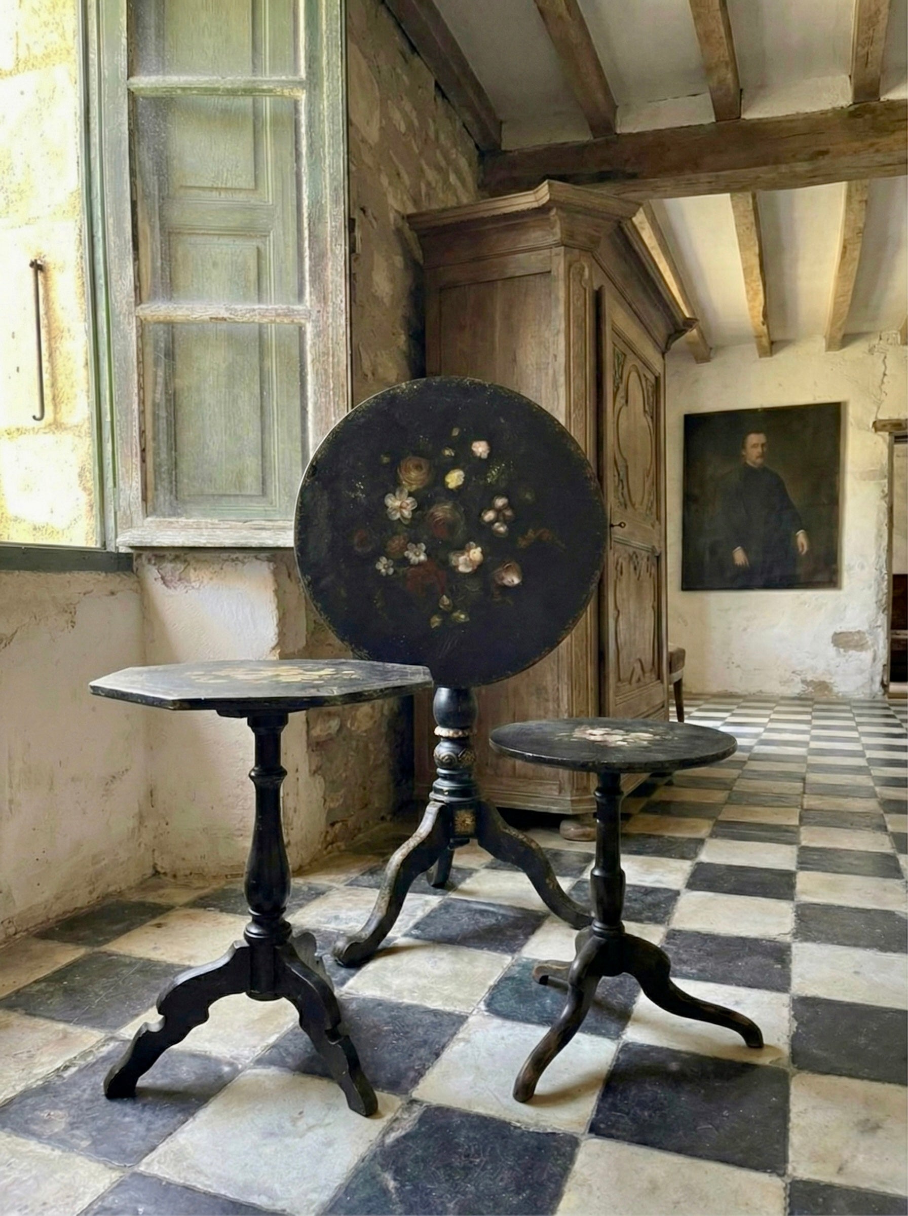 Las piezas presentan tapas redondas y octogonales, sostenidas por patas trípodes, un diseño característico de los veladores napoleónicos de finales del siglo XIX. La decoración floral, ejecutada artesanalmente, se dispone sobre el fondo negro lacado, creando un contraste elegante y atemporal.