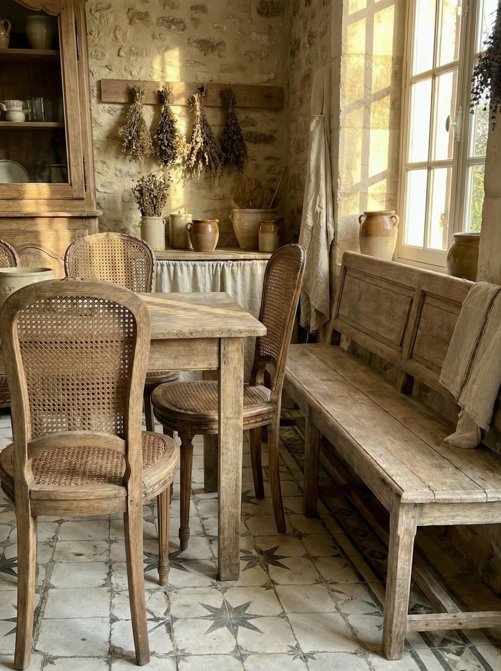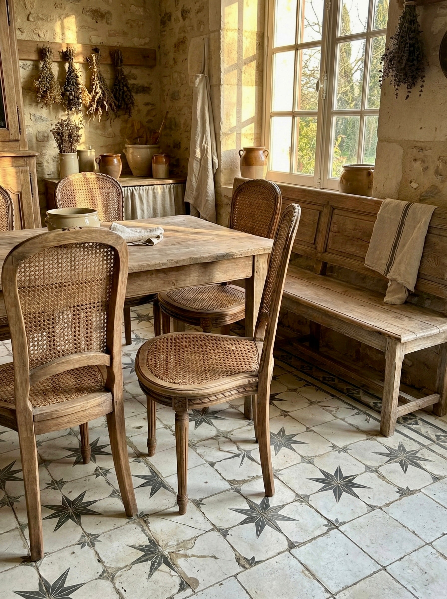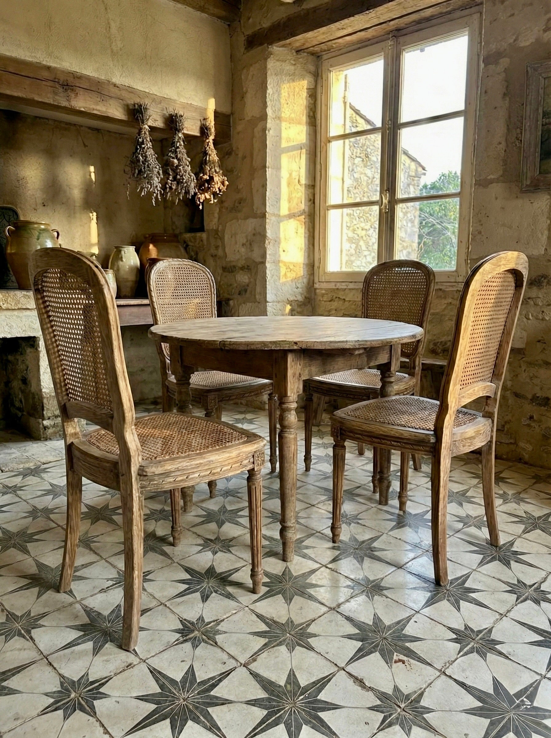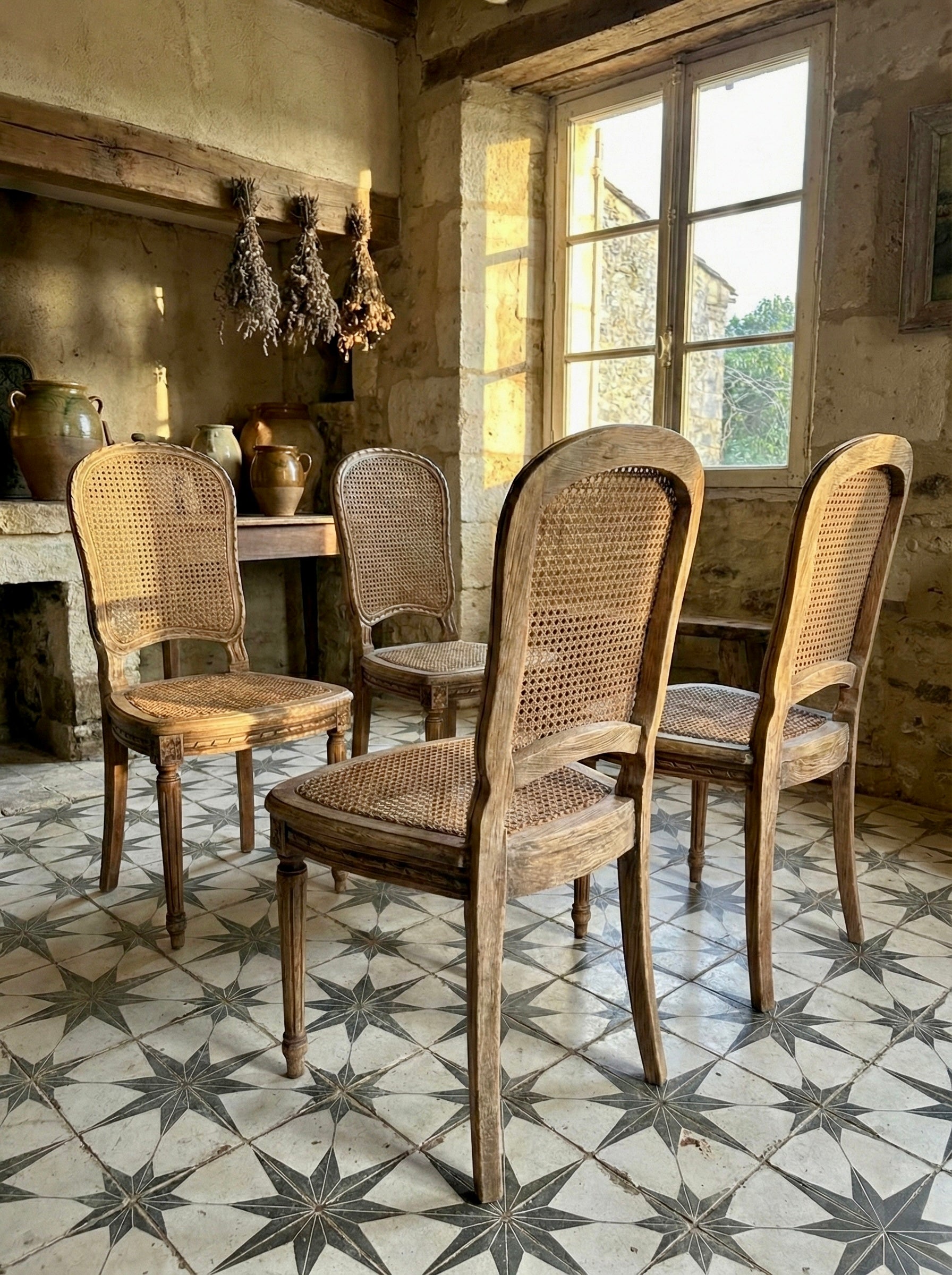 Conjunto de 4 sillas de roble macizo lavado y rejilla original